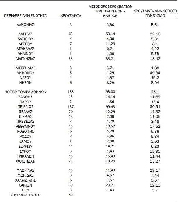 Με βάση τα επιβεβαιωμένα κρούσματα των τελευταίων 7 ημερών, 50 θεωρούνται σχετιζόμενα με ταξίδι από το εξωτερικό και 2.629 είναι σχετιζόμενα με ήδη γνωστό κρούσμα.