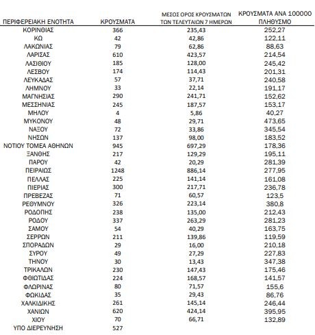 Με βάση τα επιβεβαιωμένα κρούσματα των τελευταίων 7 ημερών, 443 θεωρούνται σχετιζόμενα με ταξίδι από το εξωτερικό και 2.214 είναι σχετιζόμενα με ήδη γνωστό κρούσμα.