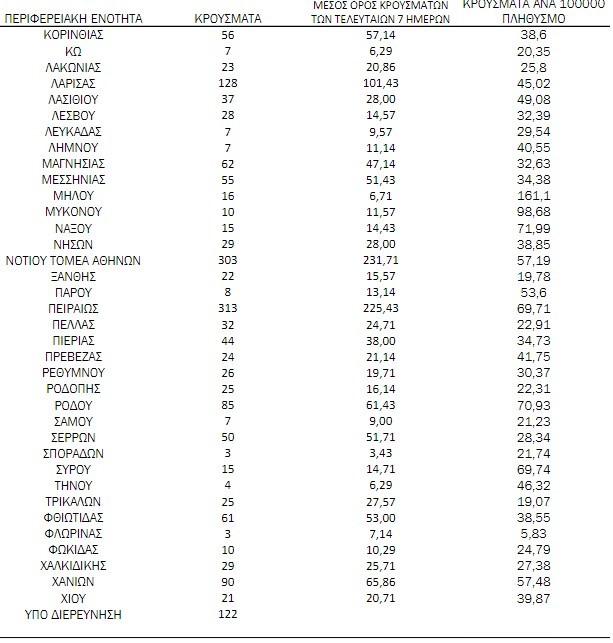 Τα νέα εργαστηριακά επιβεβαιωμένα κρούσματα της νόσου(άτομα) που καταγράφηκαν τις τελευταίες 24 ώρες ήταν 4.626. Ο συνολικός αριθμός των ατόμων που νόσησαν ανέρχεται σε 3.406.553 (ημερήσια μεταβολή +0.1%), εκ των οποίων 48.8% άνδρες.