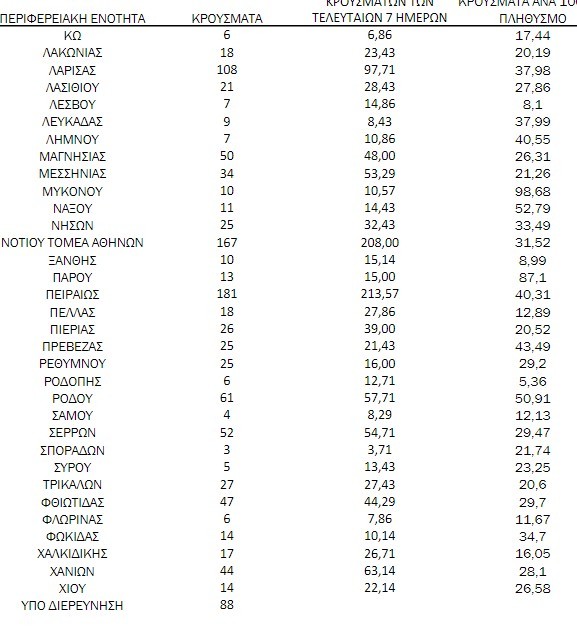 Τα νέα εργαστηριακά επιβεβαιωμένα κρούσματα της νόσου(άτομα) που καταγράφηκαν τις τελευταίες 24 ώρες ήταν 3.066. Ο συνολικός αριθμός των ατόμων που νόσησαν ανέρχεται σε 3.395.641 (ημερήσια μεταβολή +0.1%), εκ των οποίων 48.8% άνδρες.