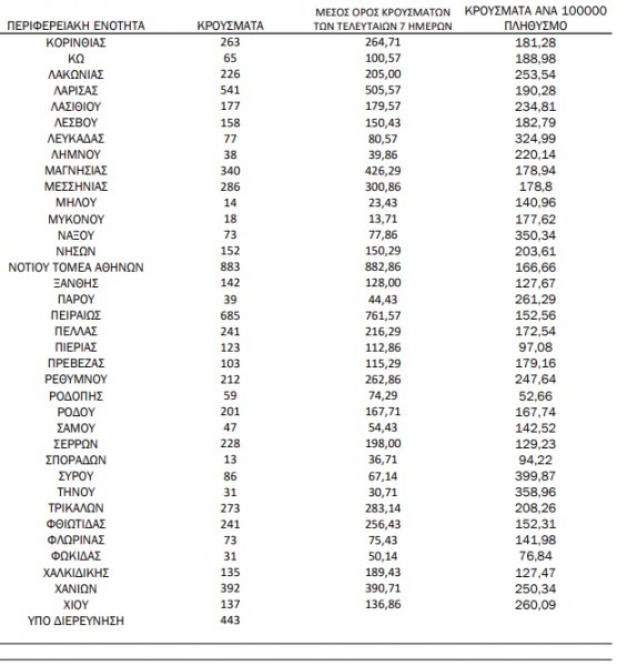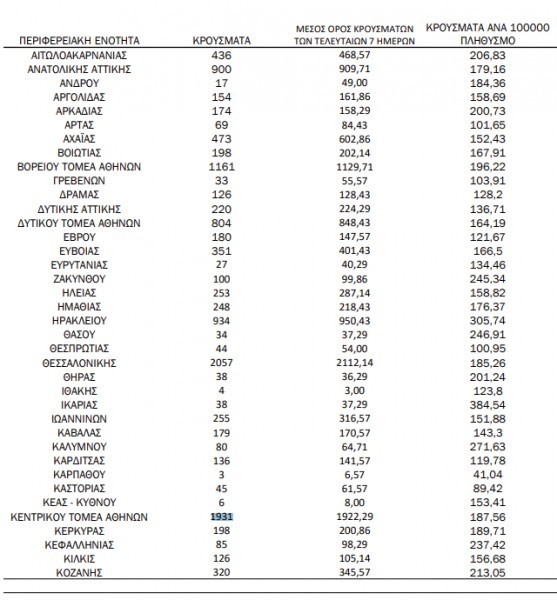 Όσον αφορά στην κατανομή των κρουσμάτων στην Αττική, από τα 7.876 κρούσματα του Λεκανοπεδίου, τα 1.931 καταγράφονται στον Κεντρικό Τομέα Αθηνών.