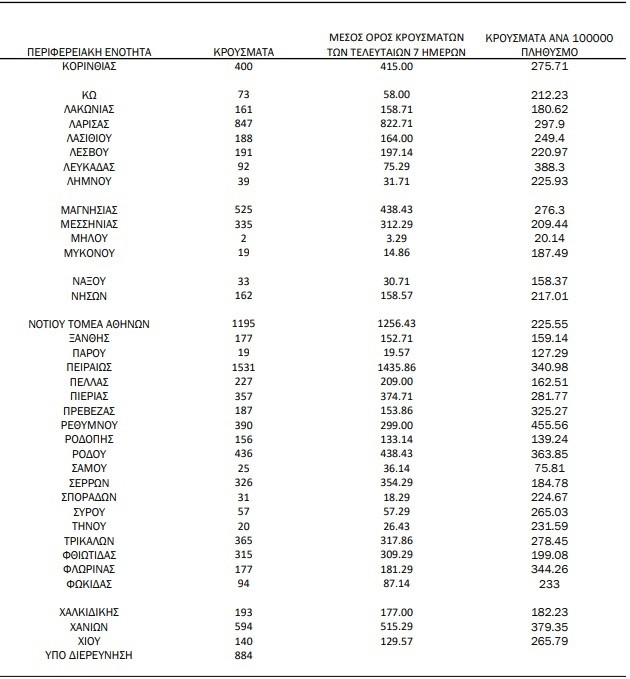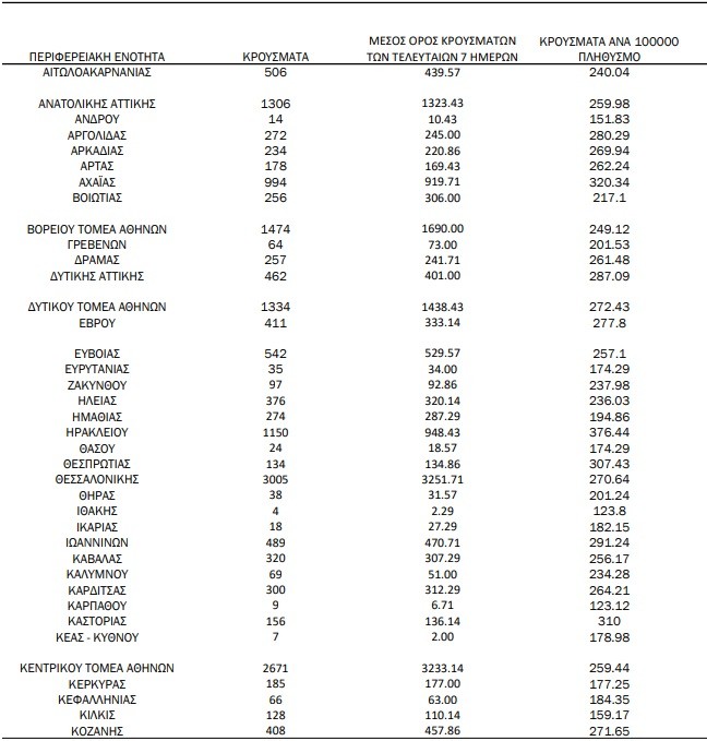 Τα νέα εργαστηριακά επιβεβαιωμένα κρούσματα της νόσου που καταγράφηκαν τις τελευταίες 24 ώρες είναι 29.334, εκ των οποίων 87 εντοπίστηκαν κατόπιν ελέγχων στις πύλες εισόδου της χώρας. Ο συνολικός αριθμός των κρουσμάτων ανέρχεται σε 1.451.354 (ημερήσια μεταβολή +2.1%), εκ των οποίων 50.0% άνδρες. Με βάση τα επιβεβαιωμένα κρούσματα των τελευταίων 7 ημερών, 447 θεωρούνται σχετιζόμενα με ταξίδι από το εξωτερικό και 1.610 είναι σχετιζόμενα με ήδη γνωστό κρούσμα.