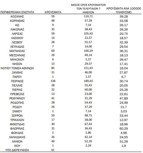 Με βάση τα επιβεβαιωμένα κρούσματα των τελευταίων 7 ημερών, 88 θεωρούνται σχετιζόμενα με ταξίδι από το εξωτερικό και 2.730 είναι σχετιζόμενα με ήδη γνωστό κρούσμα.