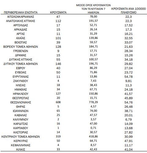 Με βάση τα επιβεβαιωμένα κρούσματα των τελευταίων 7 ημερών, 88 θεωρούνται σχετιζόμενα με ταξίδι από το εξωτερικό και 2.730 είναι σχετιζόμενα με ήδη γνωστό κρούσμα.