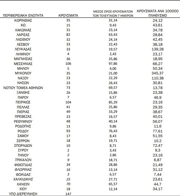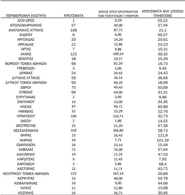 Στην Κρήτη η κατανομή των κρουσμάτων είναι η ακόλουθη: