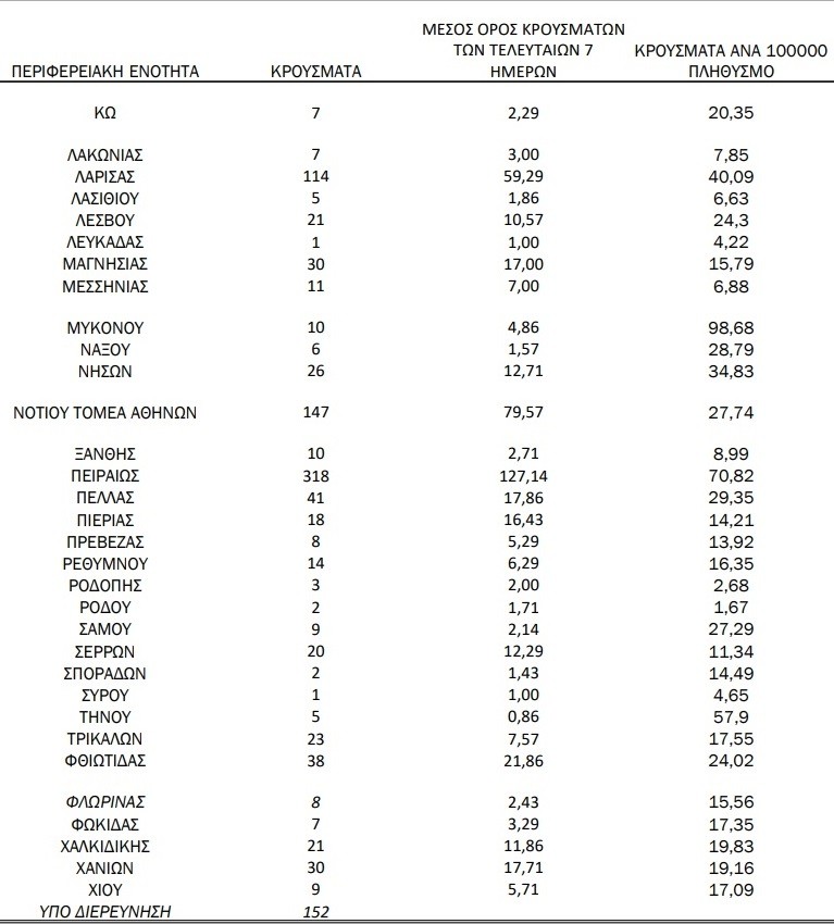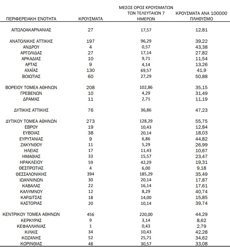 Ρεκόρ στο κέντρο της Αθήνας με 456 κρούσματα, η Θεσσαλονίκη αγγίζει πάλι τα 400 (394), ενώ η Αχαΐα καταγράφει 130 κρούσματα και η Λάρισα 114.