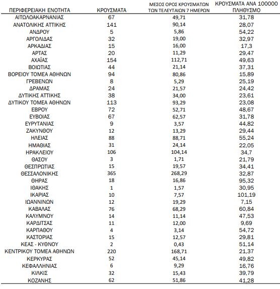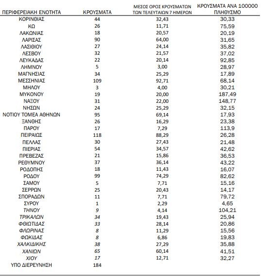 Με βάση τα επιβεβαιωμένα κρούσματα των τελευταίων 7 ημερών, 216 θεωρούνται σχετιζόμενα με ταξίδι από το εξωτερικό και 1.845 είναι σχετιζόμενα με ήδη γνωστό κρούσμα.