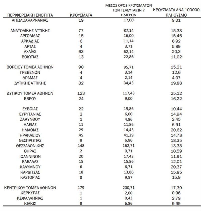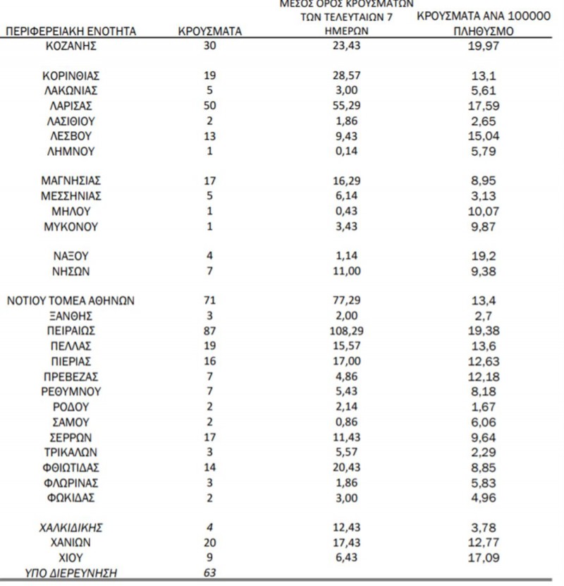 Η γεωγραφική κατανομή των νέων κρουσμάτων ανά περιφερειακή ενότητα: