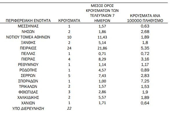 Η κατανομή των κρουσμάτων ανά περιφερειακή ενότητα: