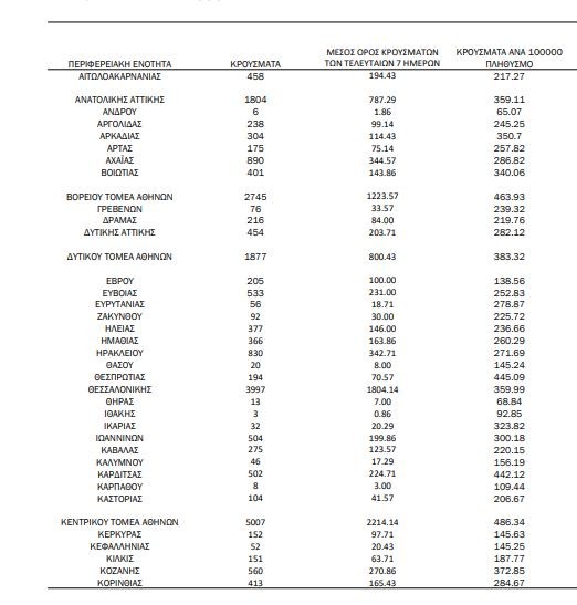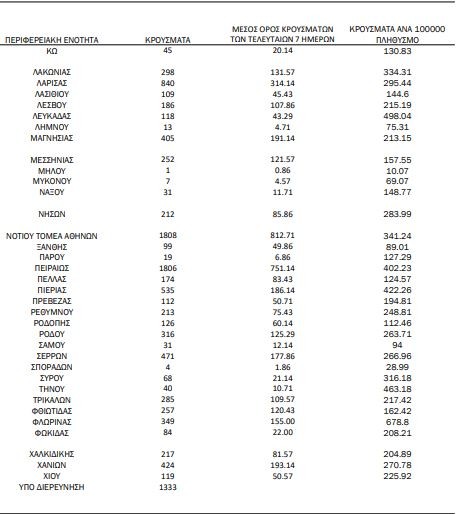 Ο συνολικός αριθμός των κρουσμάτων ανέρχεται σε 1.170.293 (ημερήσια μεταβολή +3.1%), εκ των οποίων 50.4% άνδρες. Με βάση τα επιβεβαιωμένα κρούσματα των τελευταίων 7 ημερών, 217 θεωρούνται σχετιζόμενα με ταξίδι από το εξωτερικό και 1.410 είναι σχετιζόμενα με ήδη γνωστό κρούσμα.