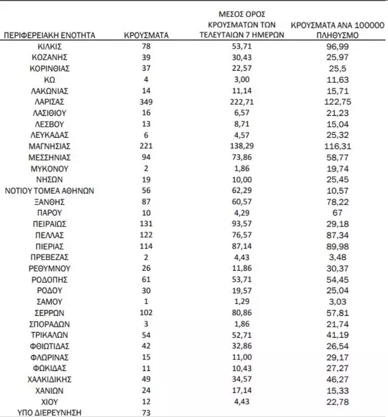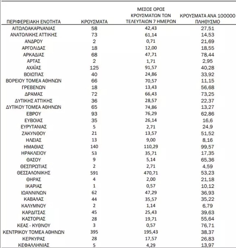 Στον «αστερισμό» των περιφερειών με τριψήφιο αριθμό κρουσμάτων βρίσκονται επίσης η Ημαθία με 140, η Αχαΐα με 125,  η Πέλλα με 122, η Πιερία με 114 και οι Σέρρες με 102.