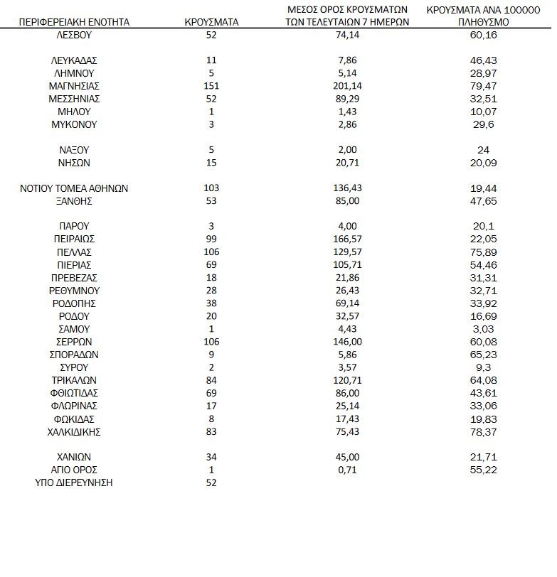 Αναλυτικά η κατανομή των κρουσμάτων σε όλη τη χώρα: