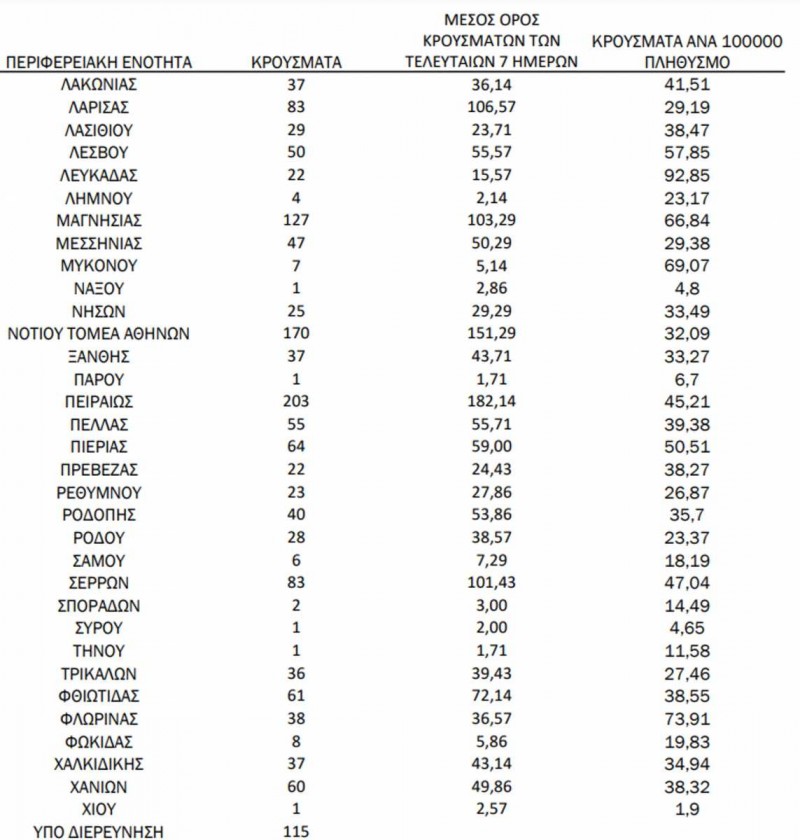 Με βάση τα επιβεβαιωμένα κρούσματα των τελευταίων 7 ημερών, 88 θεωρούνται σχετιζόμενα με ταξίδι από το εξωτερικό και 2.921 είναι σχετιζόμενα με ήδη γνωστό κρούσμα.