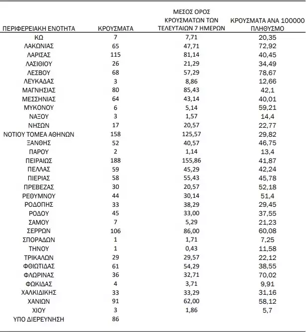 Με βάση τα επιβεβαιωμένα κρούσματα των τελευταίων 7 ημερών, 137 θεωρούνται σχετιζόμενα με ταξίδι από το εξωτερικό και 2.837 είναι σχετιζόμενα με ήδη γνωστό κρούσμα.