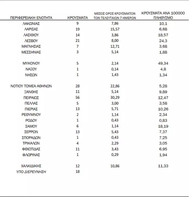 Αναλυτικά τα σημερινά κρούσματα ανά περιφέρεια, σύμφωνα με την ανακοίνωση του ΕΟΔΥ: