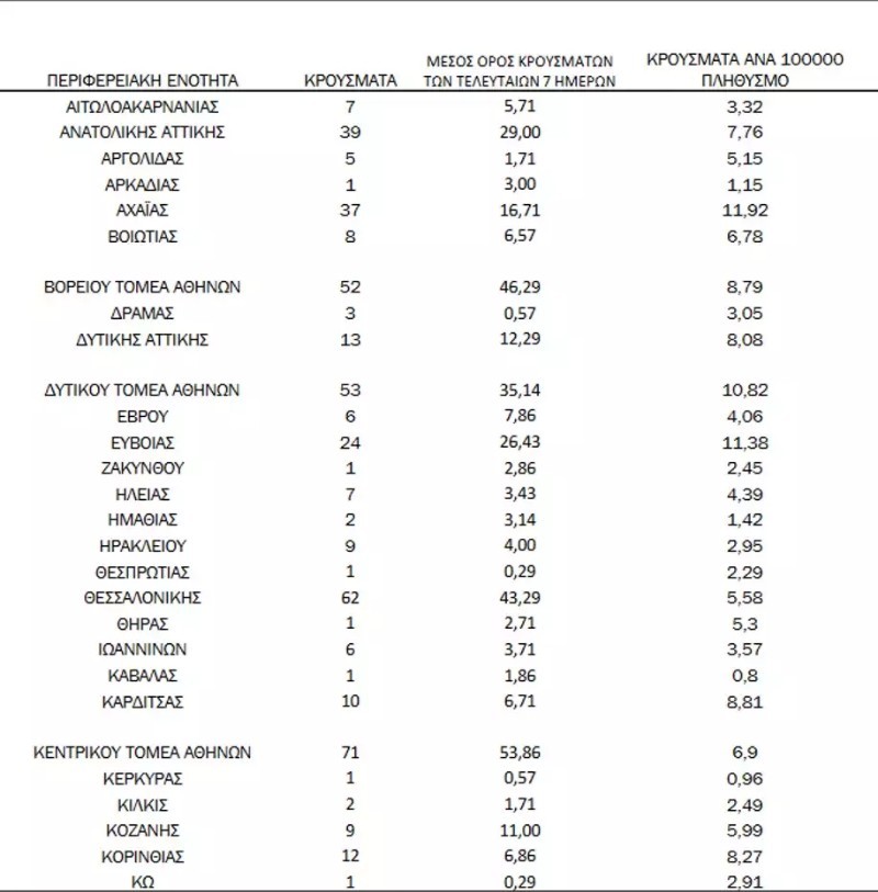 Αναλυτικά τα σημερινά κρούσματα ανά περιφέρεια, σύμφωνα με την ανακοίνωση του ΕΟΔΥ: