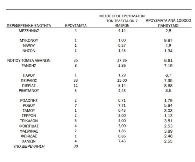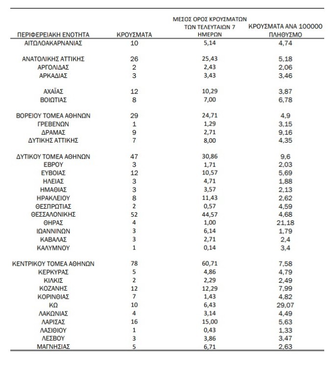 Ο συνολικός αριθμός των κρουσμάτων ανέρχεται σε 416.741 (ημερήσια μεταβολή +0.1%), εκ των οποίων 51.2% άνδρες. Με βάση τα επιβεβαιωμένα κρούσματα των τελευταίων 7 ημερών, 24 θεωρούνται σχετιζόμενα με ταξίδι από το εξωτερικό και 1.089 είναι σχετιζόμενα με ήδη γνωστό κρούσμα. To Rt για την επικράτεια εκτιμάται σε 0.8 (95%Crl: 0.09 – 1.59).