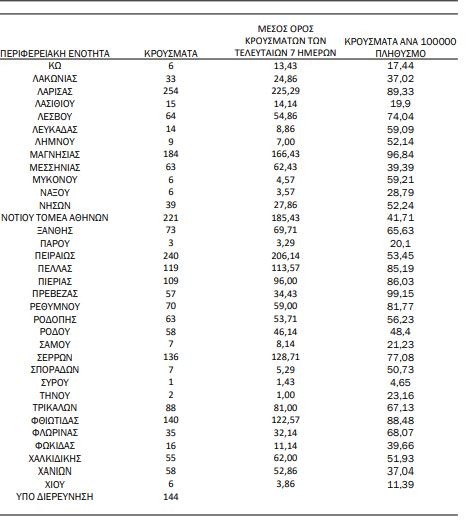 Τα στοιχεία που παρουσιάζονται αφορούν περιστατικά από την επιδημιολογική επιτήρηση της νόσου από το νέο κορωνοϊό (COVID19), με βάση τα δεδομένα που έχουν δηλωθεί στον ΕΟΔΥ και καταγραφεί μέχρι τις 24 Νοεμβρίου 2021 (ώρα 15:00).