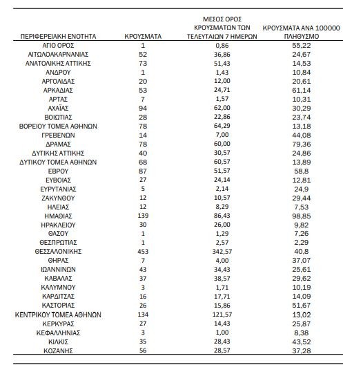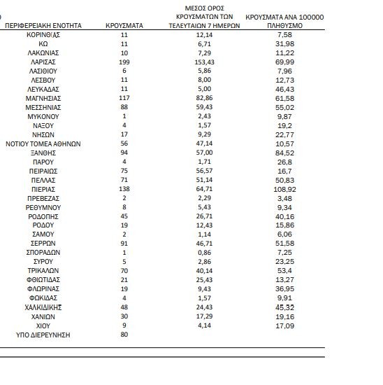 Επίσης τριψήφιος αριθμών κρουσμάτων καταγράφηκε στην Ημαθία 139, στην Πιερία 138 και στη Μαγνησία 117.