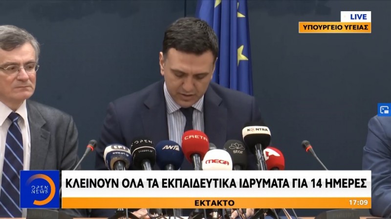 Την αναστολή της λειτουργίας όλων των εκπαιδευτικών ιδρυμάτων της χώρας προχωράει η κυβέρνηση, για προληπτικούς λόγους, προκειμένου να μειωθεί η διασπορά του κοροναϊού στη χώρα, ανακοίνωσε πριν από λίγο ο υπουργός Υγείας Βασίλης Κικίλιας.