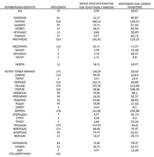 Στο κόκκινο παραμένει και η Θεσσαλονίκη με 1.298 και η Λάρισα με 425.