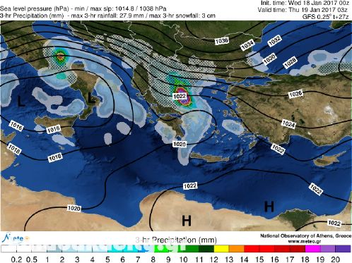 Οι παρακάτω χάρτες δίνουν την κατανομή της πίεσης και του υετού (βροχοπτώσεις και χιονοπτώσεις) το βράδυ της Τετάρτης 18/01 και το ξημέρωμα της Πέμπτης 19/01
