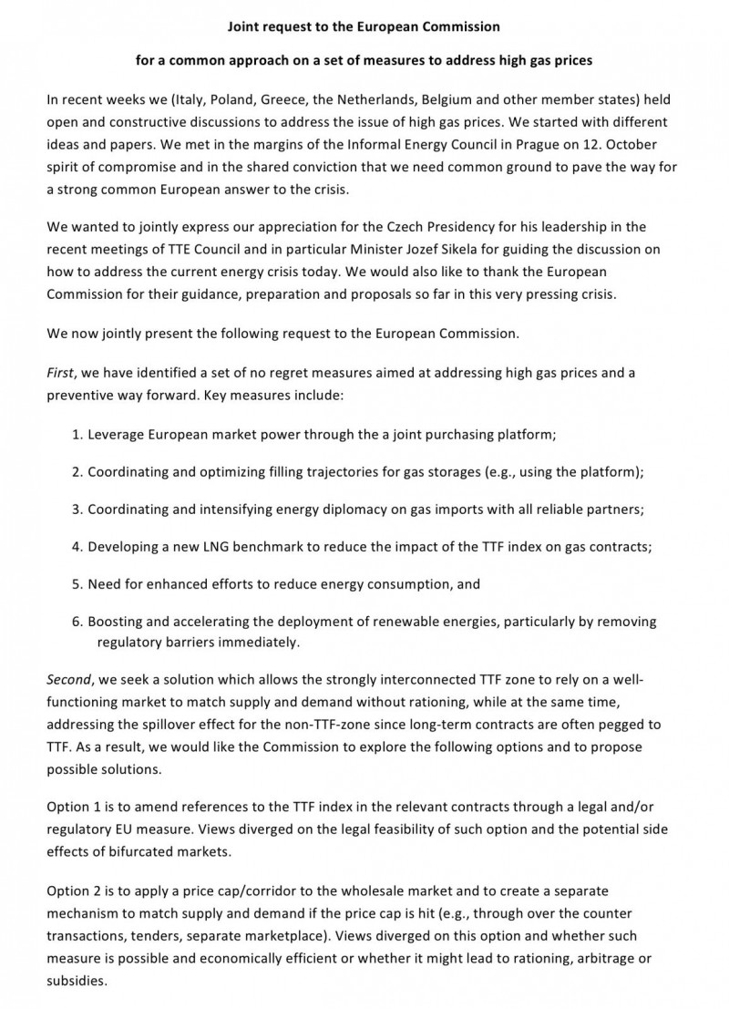 Μετά από πολύωρες διαπραγματεύσεις μεταξύ των Υπουργών Ενέργειας της Ελλάδας, της Ιταλίας, του Βελγίου, της Ολλανδίας και της Πολωνίας εστάλη μια κοινή επιστολή προς την Ευρωπαϊκή Επιτροπή για την αντιμετώπιση των υψηλών τιμών φυσικού αερίου. Οι σχετικές συζητήσεις ξεκίνησαν το βράδυ της Τρίτης 11 Οκτωβρίου, κατά τη διάρκεια του άτυπου Συμβουλίου Ενέργειας, και ολοκληρώθηκαν πριν από λίγο, σε πνεύμα εποικοδομητικής συνεργασίας.