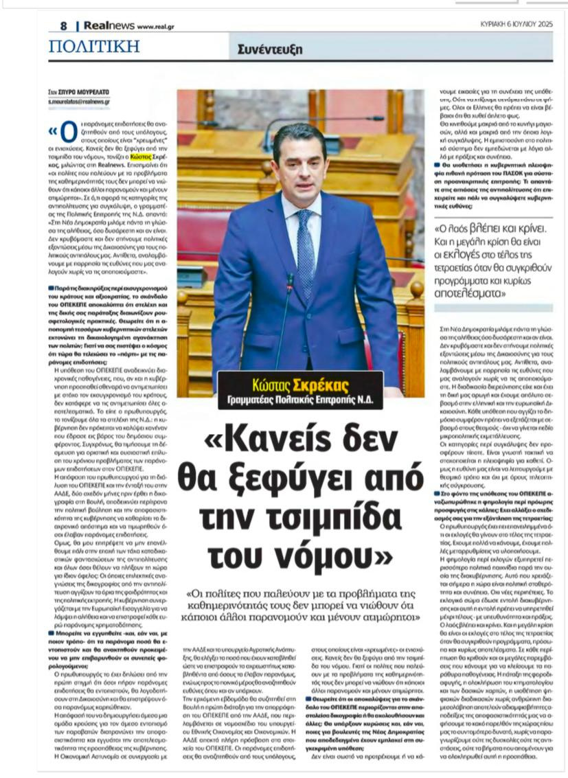 «Κανείς δεν θα ξεφύγει από την τσιμπίδα του νόμου», τονίζει σε συνέντευξή του στην εφημερίδα Real News, ο Γραμματέας της Νέας Δημοκρατίας, Κώστας Σκρέκας αναφερόμενος στην υπόθεση του ΟΠΕΚΕΠΕ, υπογραμμίζοντας ότι «οι διαχρονικές παθογένειες της δημόσιας διοίκησης δεν εξαλείφονται σε μία νύχτα, αλλά απαιτούν βαθιές και δύσκολες τομές».