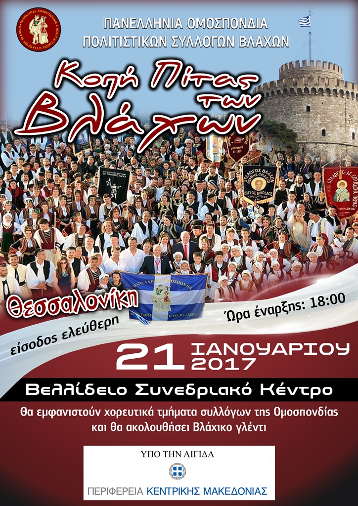 Η Πανελλήνια Ομοσπονδία Πολιτιστικών Συλλόγων Βλάχων διοργανώνει την εκδήλωση κοπή Πίτας των Βλάχων στο Συνεδριακό Κέντρο “Ι. Βελλίδης” στη Θεσσαλονίκη, το Σάββατο 21 Ιανουαρίου 2017 ώρα έναρξης 18:00