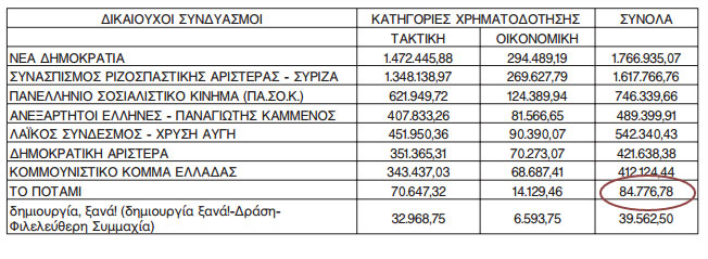 – το Ποτάμι με 6,6% στις ευρωεκλογές και 6,05% στις εθνικές εκλογές λαμβάνει 84.776 ευρώ.