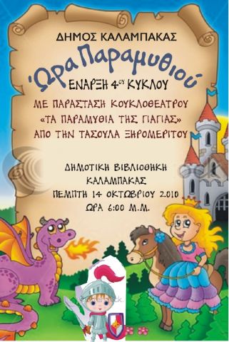 Ξεκινά την Πέμπτη 14 Οκτωβρίου ο 4ος κύκλος της ενότητας “Ώρα Παραμυθιού” της Δημοτική Βιβλιοθήκης Καλαμπάκας. Ξεκινά την Πέμπτη 14 Οκτωβρίου ο 4ος κύκλος της ενότητας “Ώρα Παραμυθιού” της Δημοτική Βιβλιοθήκης Καλαμπάκας. Για ακόμα μια χρονιά η Δημοτική Βιβλιοθήκη θα ταξιδέψει μικρούς και μεγάλους στα μονοπάτια της μάθησης και του βιβλίου μέσα από όμορφες εκδηλώσεις. Η αρχή της 4ης ενότητας περιλαμβάνει κουκλοθέατρο από την Τασούλα Ξηρομερίτου. Ώρα έναρξης της “παράστασης” 18:00 το απόγευμα.