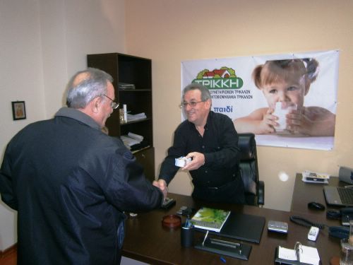 Ο Πρόεδρος της Ε.Α.Σ. Τρικάλων και Διευθύνων Σύμβουλος της θυγατρικής Συνεταιριστικής Γαλακτοβιομηχανίας ΤΡΙΚΚΗ κ. Αχιλλέας Λιούτας, παρόντων του Προέδρου του Δ.Σ. της ΤΡΙΚΚΗ κ. Δημήτρη Ιακωβάκη, του Μέλος του Δ.Σ. της Ε.Α.Σ. Τρικάλων κ. Στέφανου Ντάκου του Διευθυντή της κ. Όθωνα Σιάγκα και του Διευθυντή της ΤΡΙΚΚΗ κ. Γιώργου Μέρτζου, παρέδωσε τα κουπόνια στους εκπροσώπους των Συλλόγων και Οργανώσεων των Νομών Τρικάλων και Καρδίτσας που εκδήλωσαν ενδιαφέρον για τη συμμετοχή στο πρόγραμμα ΚΑΝΕΝΑ ΠΑΙΔΙ ΧΩΡΙΣ ΓΑΛΑ.
