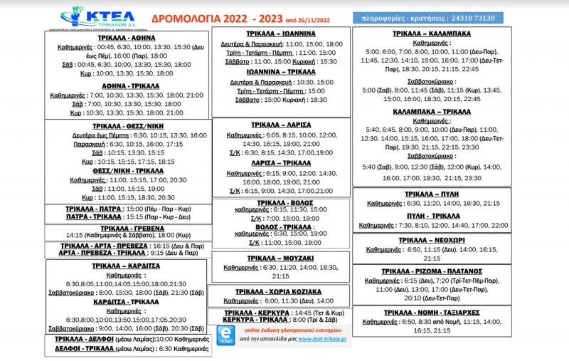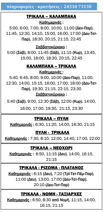 Ενημερώνουμε το επιβατικό κοινό ότι από τη Δευτέρα 5 Δεκεμβρίου τα δρομολόγια του Υπεραστικού ΚΤΕΛ Τρικάλων από Καλαμπάκα προς Μετέωρα και αντίστροφα θα εκτελούνται καθημερινά ως εξής :