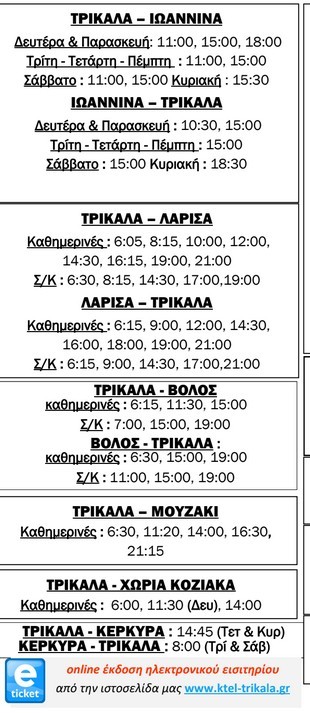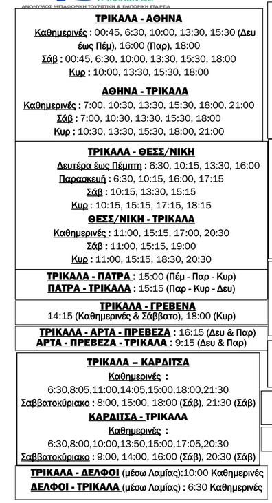 Ενημερώνουμε το επιβατικό κοινό ότι από τη Δευτέρα 5 Δεκεμβρίου τα δρομολόγια του Υπεραστικού ΚΤΕΛ Τρικάλων από Καλαμπάκα προς Μετέωρα και αντίστροφα θα εκτελούνται καθημερινά ως εξής :