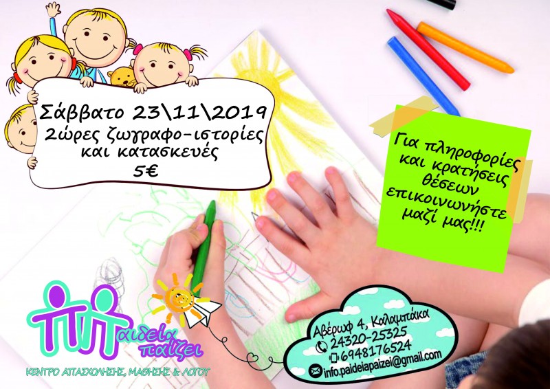 - 1η συνάντηση Σάββατο 23.11.2019 11:00-13:00 – Κόστος συμμετοχής 5€ ανά παιδί.