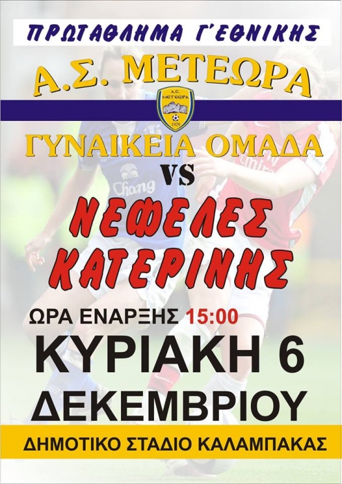 Συγκεκριμένα την Κυριακή ( αύριο ) 6 Δεκεμβρίου και ώρα 15:00 στο γήπεδο της Καλαμπάκας θα πραγματοποιηθεί το παιχνίδι Α.Σ. ΜΕΤΕΩΡΑ – Α.Π.Σ. Νεφέλες Κατερίνης με διαιτητές τους Νικόλαο Χήτος, και Α΄ Βοηθό την Αλεξάνδρα Δεληγιάννη και Β΄ Βοηθό την Ευαγγελία Δεληγιάννη (Ε.Π.Σ. Λάρισας).