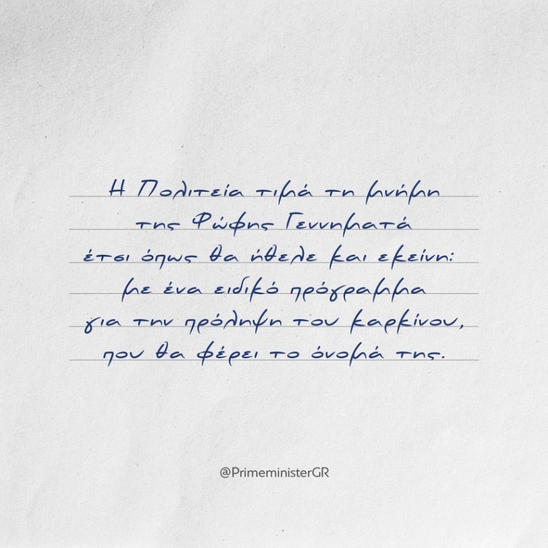 Ο πρωθυπουργός έγραψε χαρακτηριστικά: “Η Πολιτεία τιμά τη μνήμη της Φώφης Γεννηματά έτσι όπως θα ήθελε και εκείνη: με ένα ειδικό πρόγραμμα για την πρόληψη του καρκίνου, που θα φέρει το όνομά της.