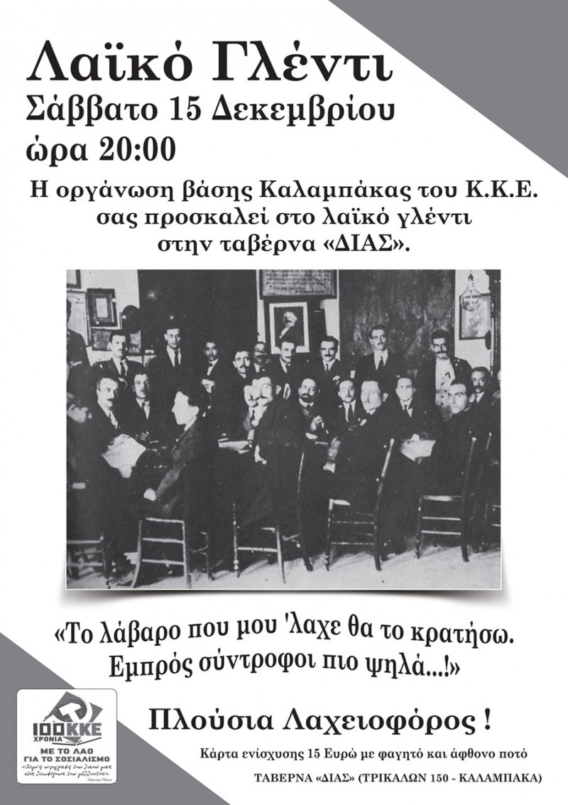 Πολιτιστική- Πολιτική εκδήλωση διοργανώνει η ΚΟΒ Καλαμπάκας του ΚΚΕ το Σάββατο 15 Δεκέμβρη στις 8 μμ στην Ταβέρνα «Δίας» (οδός Τρικάλων 150).