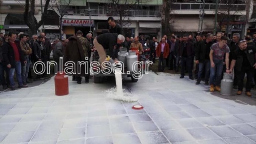 Κυριολεκτικά… άσπρισε το πρωί της Τρίτης η πλατεία Ρήγα Φεραίου, γνωστή ως πλατεία Νομαρχίας στη Λάρισα, έξω από το κτήριο της Περιφερειακής Ενότητας. Δεκάδες κτηνοτρόφοι έχυσαν γάλα και έκλεισαν με αχυρόμπαλες την είσοδο της Περιφέρειας, διαμαρτυρόμενοι για την πολιτική που ασκεί η κυβέρνηση.