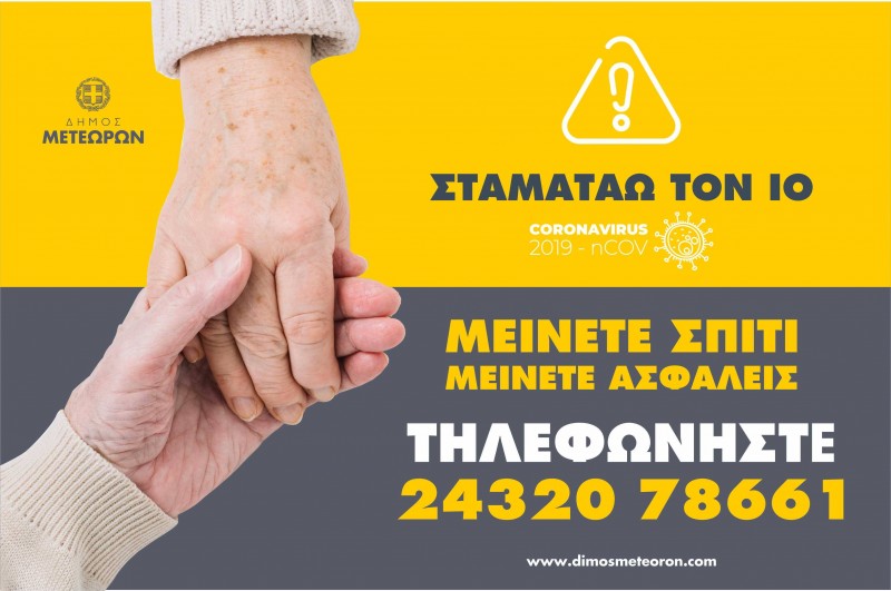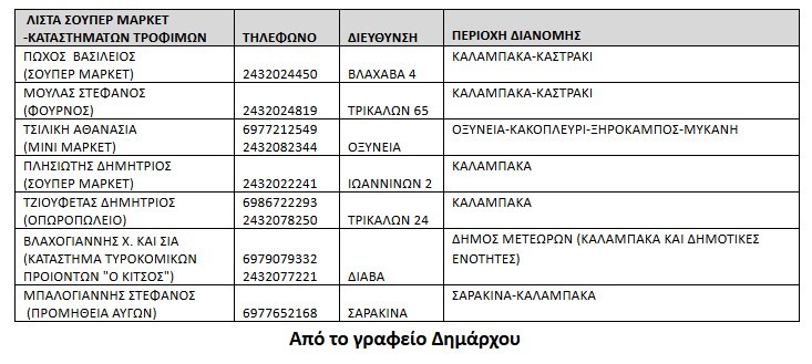 Ο Δήμος Μετεώρων, στα πλαίσια λήψης μέτρων αποφυγής και περιορισμού της διάδοσης του Κορωνοϊού – COVID 19, ύστερα από έκκληση που απηύθυνε προς τους εμπόρους – καταστηματάρχες ειδών πρώτης ανάγκης (Supermarket, Minimarket, κ.λ.π.), του Δήμου μας, οι οποίοι κάνουν κατ’ οίκον παράδοση, παραθέτει τη λίστα των καταστημάτων με τα οποία μπορούν να επικοινωνούν άτομα που χρήζουν βοήθειας και αδυνατούν ή δεν τους επιτρέπεται να μετακινηθούν για να εξυπηρετήσουν τις ανάγκες τους.