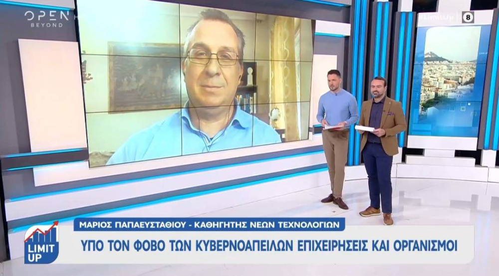 Στην ενημερωτική εκπομπή «Limit Up» του OPEN TV, με τους δημοσιογράφους Γιάννη Φώσκολο και Αντώνη Κρητικό, ο Καθηγητής Οικονομίας και Νέων Τεχνολογιών Μάριος Παπαευσταθίου μιλά για τον ψηφιακό κίνδυνο που απειλεί πολίτες και επιχειρήσεις, οργανισμούς στην εποχή της τεχνητής νοημοσύνης που μία νέα μορφή πολέμου που δεν έχει σφαίρες ούτε στρατούς, αλλά κώδικες και πληκτρολόγια.