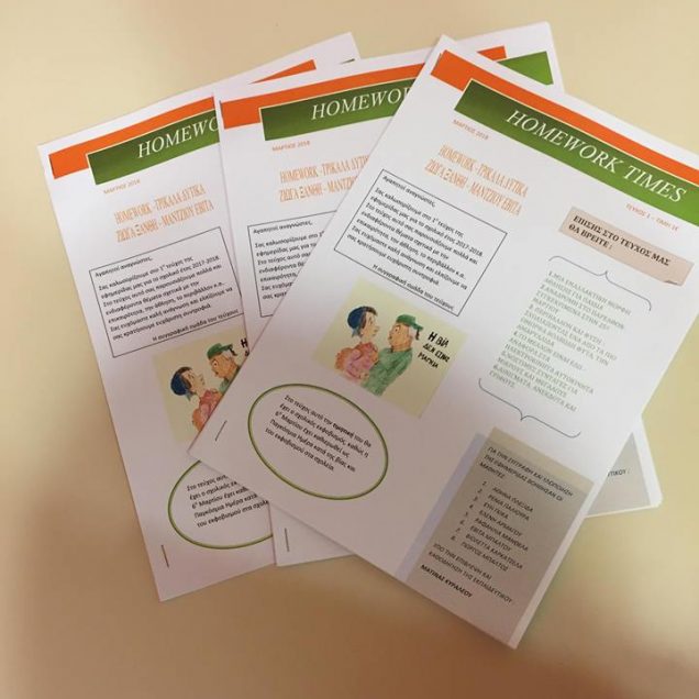 Έτσι, με μεγάλη μας χαρά σας ανακοινώνουμε πως το Κέντρο Μελέτης HOMEWORK « Ζιώγα Ξανθή – Μάντζιου Εβίτα » εξέδωσε την πρώτη του μηνιαία μαθητική εφημερίδα «HOMEWORK TIMES».