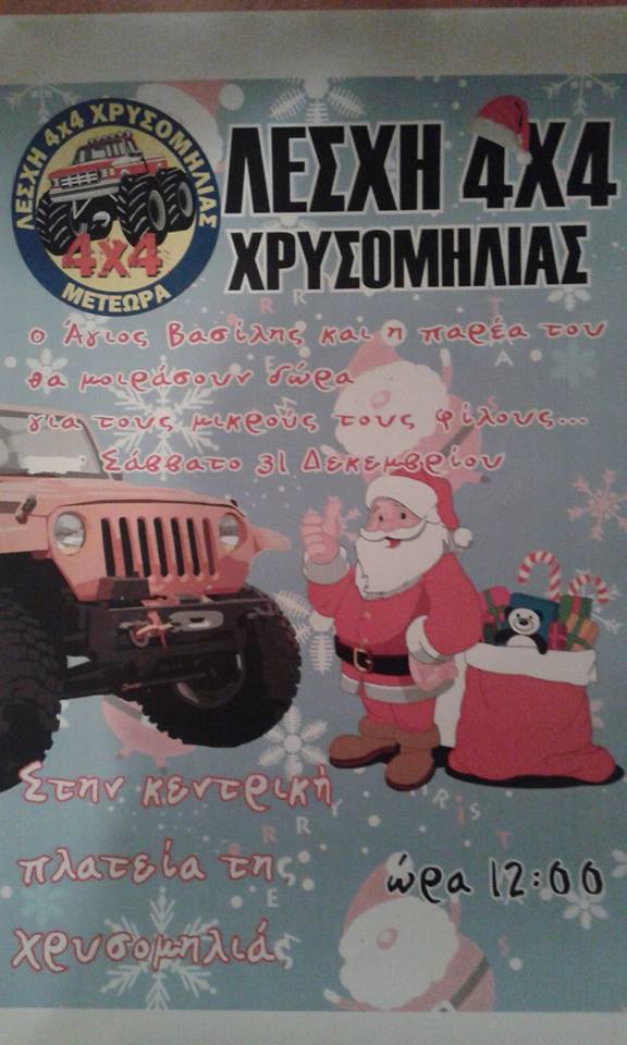 Οι άνθρωποι του Club 4×4 της Χρυσομηλιάς και φέτος τηρώντας την περυσινή υπόσχεση στα παιδιά ότι θα τα ξαναπούν του χρόνου… το Σάββατο 31 Δεκεμβρίου θα βρεθούν με τον Άγιο Βασίλη στην πλατεία του χωριού, στις 12:00 το μεσημέρι και θα μοιράσουν δώρα σε όλα τα παιδιά…