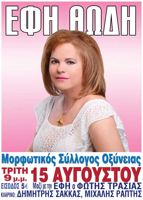Απόψε Τρίτη 15 Αυγούστου θα πραγματοποιηθεί η καλοκαιρινή εκδήλωση του Πολιτιτσικού Συλλόγου Οξύνειας “Η Μερίτσα”.