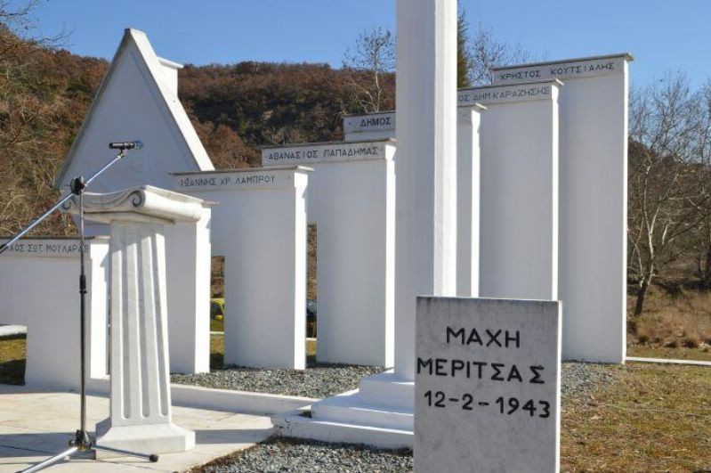 Από τούτα τα ματωμένα χώματα της Μερίτσας όπου τον Φλεβάρη του 1943 οι ψυχωμένοι αντάρτες του ΕΛΑΣ δίνοντας την πρώτη κατά μέτωπο ένοπλη μάχη απέναντι σε συγκροτημένη στρατιωτική δύναμη κατοχής κατάφεραν να αποδεκατίσουν ολόκληρο ιταλικό τάγμα και να λυτρώσουν τους κατοίκους της περιοχής από την τρομοκρατία και τη λεηλασία του μόχθου τους.