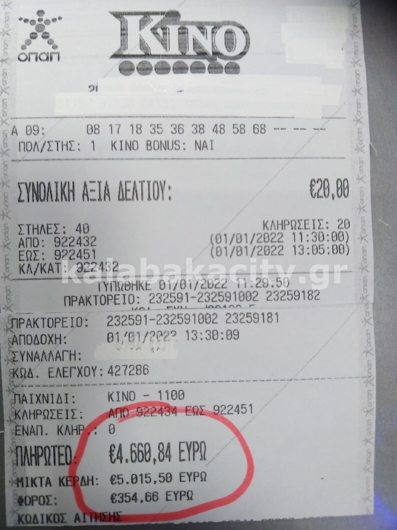 Στο πρακτορείο του συντοπίτη μας Νίκου Γκούτρα που βρίσκεται στα Τρίκαλα στην οδό Κολοκοτρώνη 21 έναντι δικαστηρίων, Τρικαλινός, την ημέρα της πρωτοχρονιάς δοκίμασε την τύχη του στο ΚΙΝΟ παίζοντας 9 νούμερα με μπόνους και έπιασε τα 8 με αποτέλεσμα να κερδίσει 4.660 ευρώ!