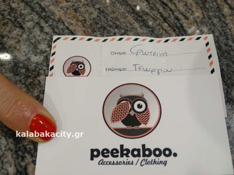 Πραγματοποιήθηκε το απόγευμα της Τρίτης η κλήρωση του καταστήματος PEEKABOO της πόλης μας , το οποίο βρίσκεται στην οδό Τρικάλων 19, με υπέροχες προτάσεις σε αξεσουάρ και ένδυση για γυναίκες και άνδρες.