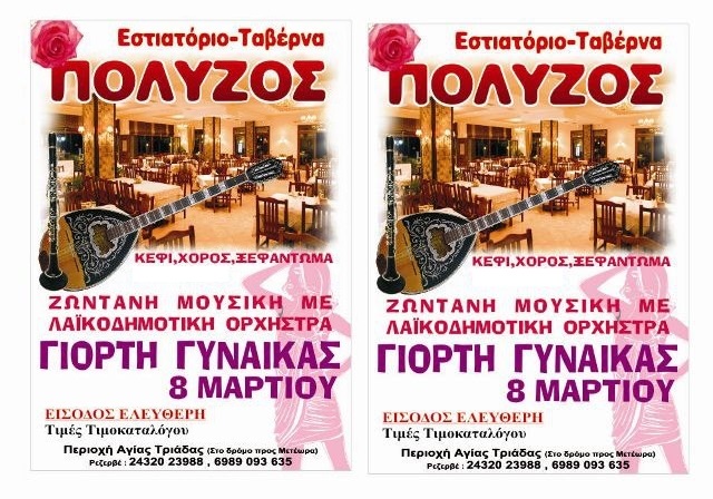 Το εστιατόριο “Πολύζος” υπόσχεται  μια υπέροχη βραδιά για όλες τις γυναίκες, με ζωντανή μουσική, κέφι, χορό, ξεφάντωμα μέχρι πρωίας με λαικοδημοτικό πρόγραμμα, απολαμβάνοντας καλό φαγητό η ποτό σε φθηνές τιμές.