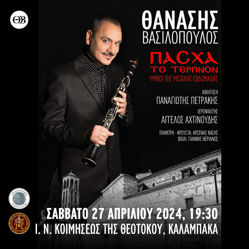 Με έμπνευση από τα έθιμα και το κατανυκτικό κλίμα των Άγιων Ημερών του Πάσχα, η Ιερά Μητρόπολη Σταγών και Μετεώρων και ο Δήμος Μετεώρων σας προσκαλούν να συμμετέχετε στην μεγάλη συναυλία «Πάσχα το Τερπνόν- Ύμνοι της Μεγάλης Εβδομάδας» υπό τους ήχους του δεξιοτέχνη του κλαρίνου Θανάση Βασιλόπουλου. Τον κ. Βασιλόπουλο πλαισιώνουν ο ηθοποιός Παναγιώτης Πετράκης και ο Ιεροψάλτης Άγγελος Αχτινούδης.