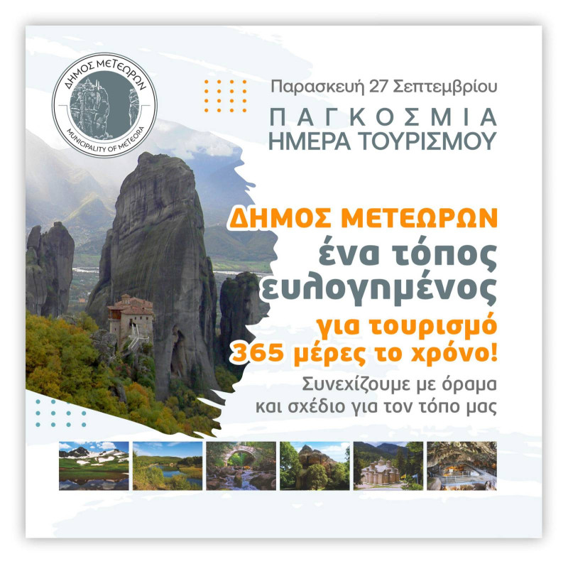 Με τρεις δράσεις γιορτάζει ο Δήμος Μετεώρων την Παγκόσμια Ημέρα Τουρισμού. Συγκεκριμένα, μέσα από ένα πρότυπο βίντεο παρουσιάζεται η νέα τουριστική σελίδα του Δήμου cityofmeteora.com. Με ένα κλικ ο επισκέπτης έρχεται σε επαφή με το απαράμιλλο φυσικό κάλλος, τα εμβληματικά μνημεία και την πολυσήμαντη πολιτιστική και θρησκευτική κληρονομιά της περιοχής. Ενώ έχει ως κύριο χαρακτηριστικό γνώρισμά της την αξιοποίηση της τεχνητής νοημοσύνης που την κάνει συμβατή με τις σύγχρονες ανάγκες και φιλική σε κάθε χρήστη..